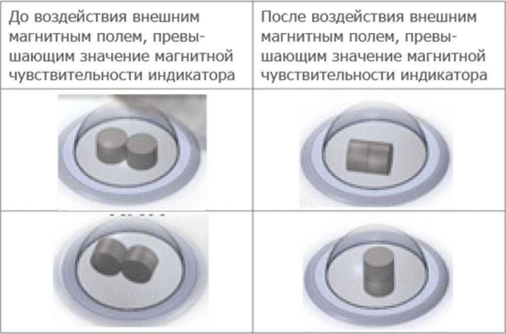 В случае воздействия магнитным полем на прибор учета с установленным индикатором, при превышении полем пороговых значений чувствительности индикатора, два магнита, размещенные в капсуле индикатора, соприкасающиеся в нормальном состоянии боками, соединятся основаниями, необратимо фиксируя воздействие магнита.