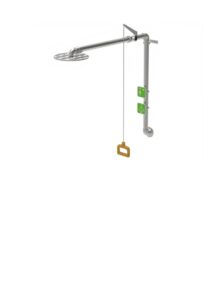 Аварийный душ предназначен для установки на стену и подходит для использования в условиях ограниченного пространства. Активация душа осуществляется при помощи вертикально подвешенной рукояти. Штанга и душирующее устройство выполнены из коррозиостойкой нержавеющей стали. Рекомендуемая высота монтажа — не более 3,6 м. (по уровню горизонтальной части излива). Комплектуется плакатом с правилами использования для персонала.