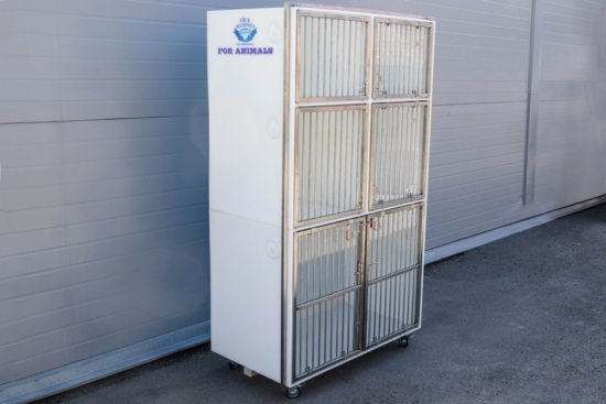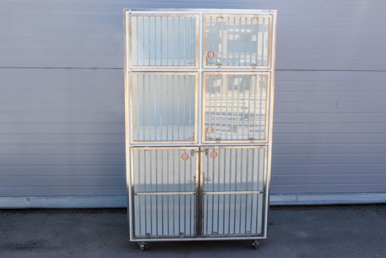 Клетка оснащена дверцей для оксигенотерапии, колесами с поворотным и стопорным механизмом.