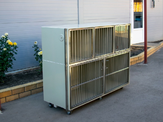 Клетка оснащена дверцей для оксигенотерапии, колесами с поворотным и стопорным механизмом.