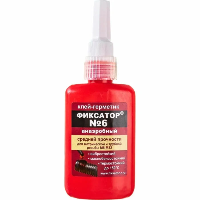 Средне-высокопрочный анаэробный клей-герметик «Фиксатор-6», представляет собой однородную тиксотропную композицию, отверждающуюся в узком зазоре между металлическими поверхностями с образованием полимера заданной прочности.